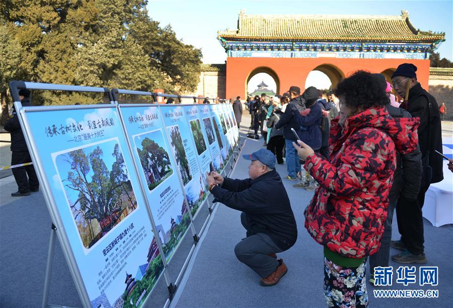 12月19日,游客在北京天壇公園觀看“最美十大樹王”展板。 新華社發(fā)(任超攝)