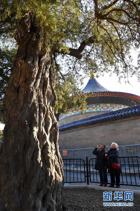 12月19日,游客從北京“最美十大樹王”之一的天壇九龍柏下走過。 新華社發(fā)(任超攝)