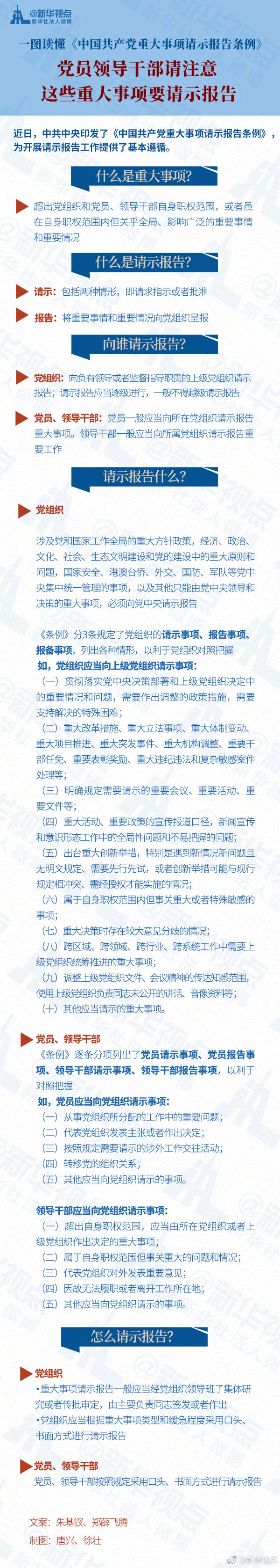 28日,中共中央印發(fā)的《中國共產(chǎn)黨重大事項(xiàng)請(qǐng)示報(bào)告條例》全文公布,為開展黨內(nèi)請(qǐng)示報(bào)告工作提供了基本遵循。黨組織、黨員、領(lǐng)導(dǎo)干部的哪些事項(xiàng)需要請(qǐng)示報(bào)告?向誰請(qǐng)示報(bào)告?怎么請(qǐng)示報(bào)告?一圖讀懂