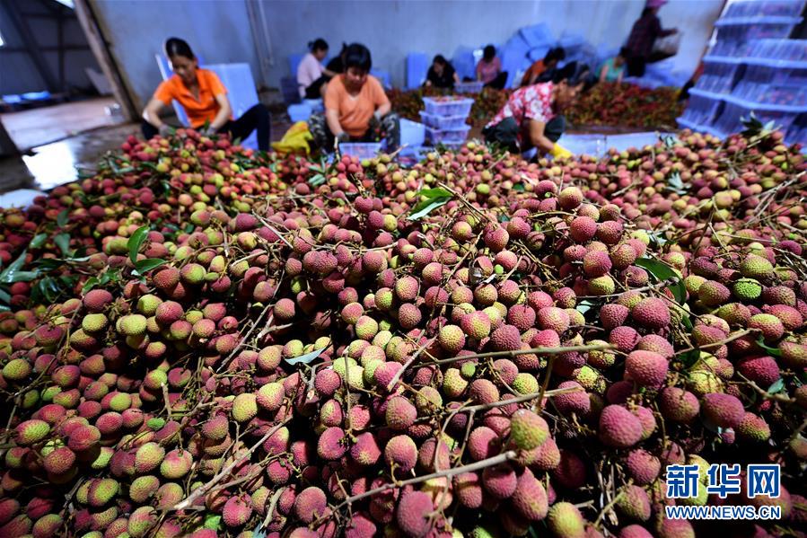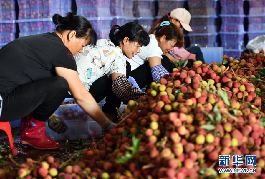 5月15日,?谑欣笾蚕磙r(nóng)莊的工作人員在分揀荔枝。