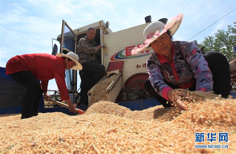 5月28日,在江蘇省連云港市東海縣雙店鎮(zhèn),村民在田間收割小麥。 新華社發(fā)(耿玉和 攝)