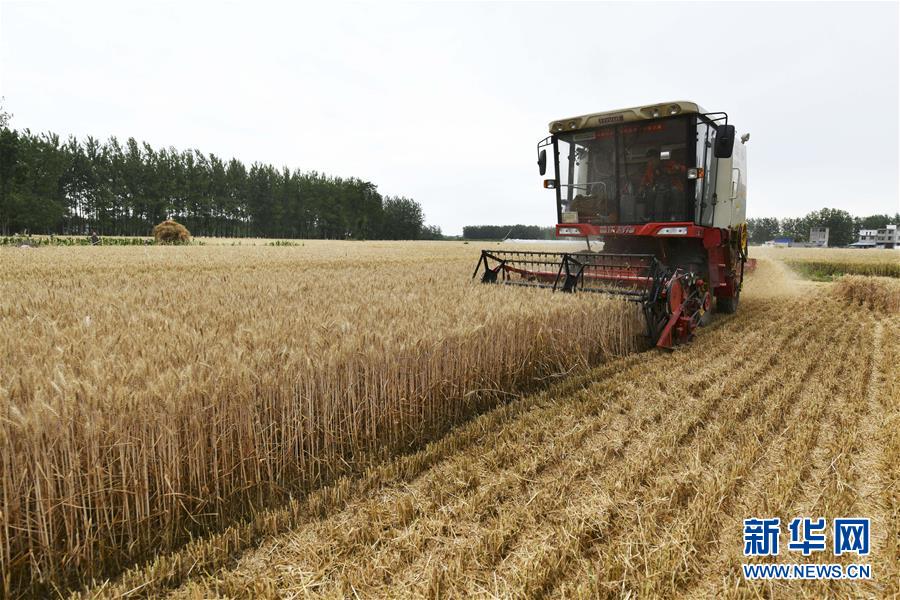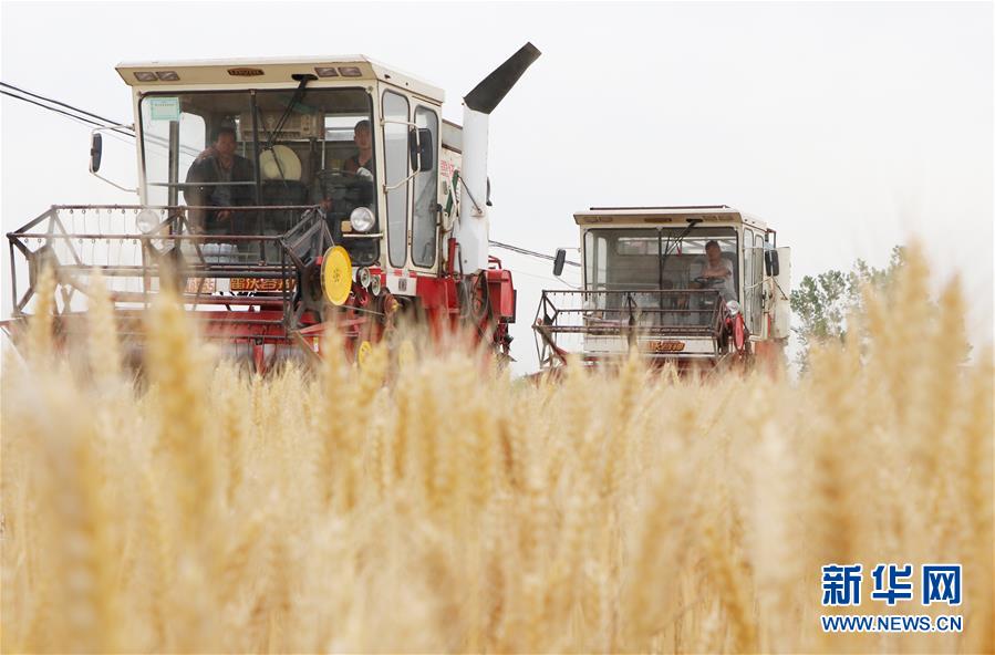 5月28日,在安徽省阜陽市臨泉縣呂寨鎮(zhèn)楊莊村,村民在田間收割小麥。 新華社發(fā)(盧啟建 攝)