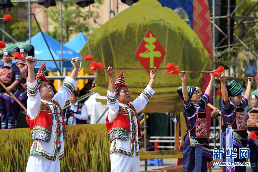 9月17日,廣西都安瑤族自治縣密洛陀文化公園廣場(chǎng),演員在啟動(dòng)儀式上表演節(jié)目《補(bǔ)糧添!贰