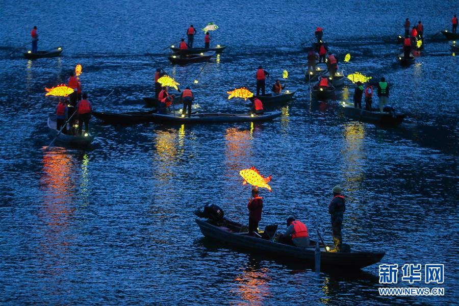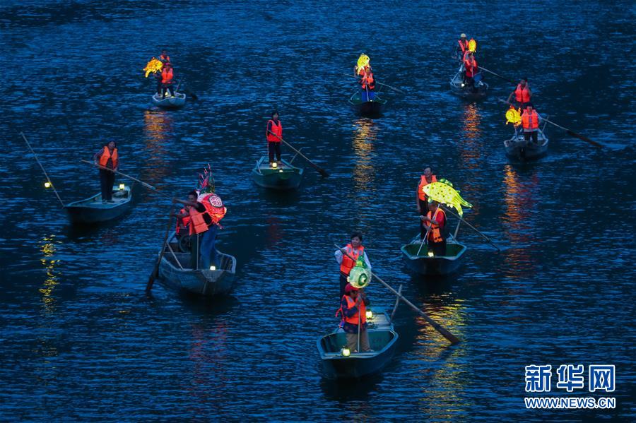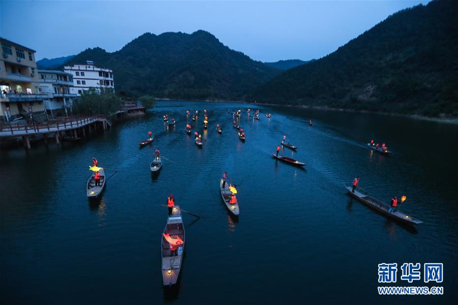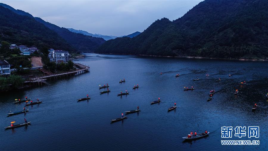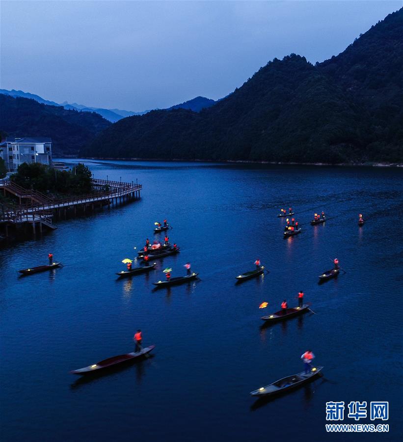 9月25日,在宋村鄉(xiāng)云源港的水面上,漁民劃著漁船,船頭點(diǎn)亮漁燈,構(gòu)成一幅“漁舟唱晚、萬(wàn)家燈火”的美麗圖景(無(wú)人機(jī)拍攝)。 近年來(lái),浙江省杭州市淳安縣宋村鄉(xiāng)積極發(fā)展鄉(xiāng)村旅游,打造漁家元素特色景觀,助力鄉(xiāng)村振興建設(shè)。目前,宋村鄉(xiāng)依托山水景觀和漁家文化,帶動(dòng)了當(dāng)?shù)鼐访袼藓图碁╂宜、自助燒烤、農(nóng)事體驗(yàn)、民俗攝影采風(fēng)為一體的特色旅游發(fā)展。2019年1月初至7月底,全鄉(xiāng)接待游客10萬(wàn)人次,實(shí)現(xiàn)旅游經(jīng)濟(jì)收入1300萬(wàn)元。 新華社記者 徐昱 攝