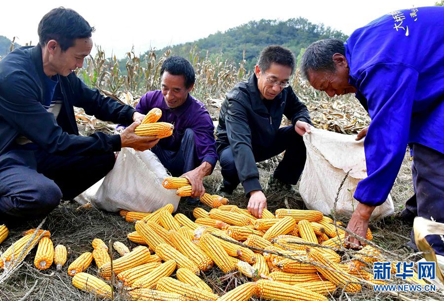 洛寧縣上戈鎮(zhèn)扶貧干部和村干部幫助村民收玉米。