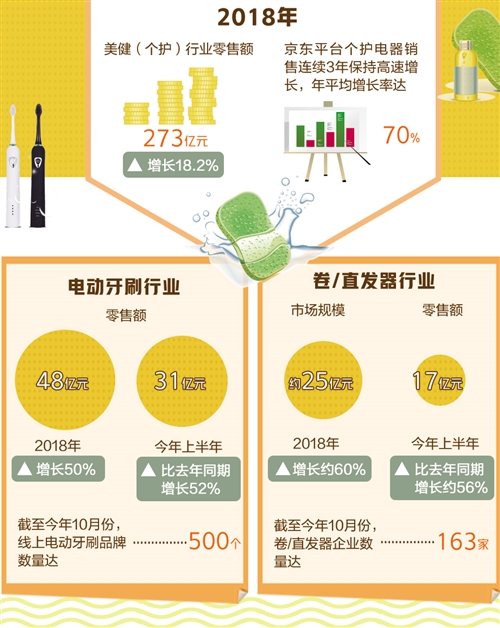 中國(guó)家用電器協(xié)會(huì)美。▊(gè)護(hù))電器專(zhuān)業(yè)委員會(huì)調(diào)查數(shù)據(jù)顯示,2018年美健(個(gè)護(hù))行業(yè)零售額273億元,增長(zhǎng)18.2%。今年上半年,電動(dòng)剃須刀、電吹風(fēng)、卷/直發(fā)器和電動(dòng)牙刷4個(gè)品類(lèi)零售額增速近40%;其中,卷/直發(fā)器和電動(dòng)牙刷兩類(lèi)產(chǎn)品零售額增速是亮點(diǎn),均超過(guò)50%,市場(chǎng)正處于成長(zhǎng)期。