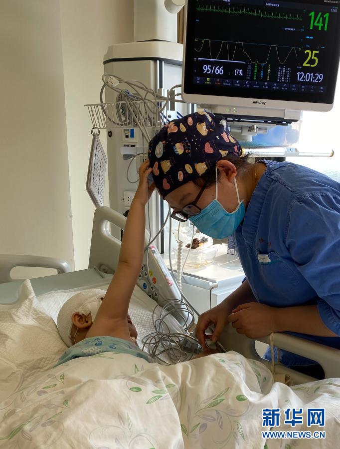 北京天壇醫(yī)院ICU護士馮雅笛在醫(yī)院與患者互動(2月11日攝)。新華社發(fā)(北京天壇醫(yī)院供圖)
