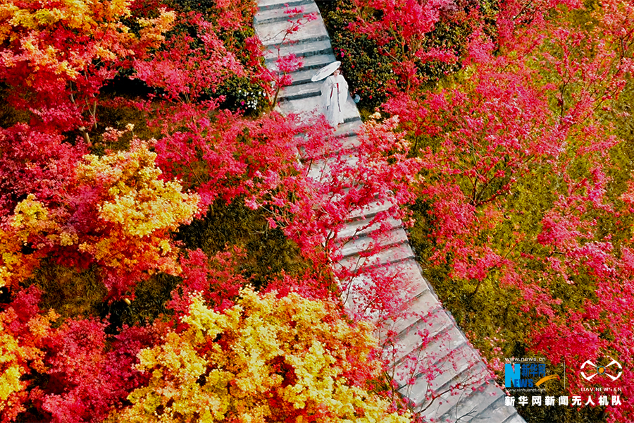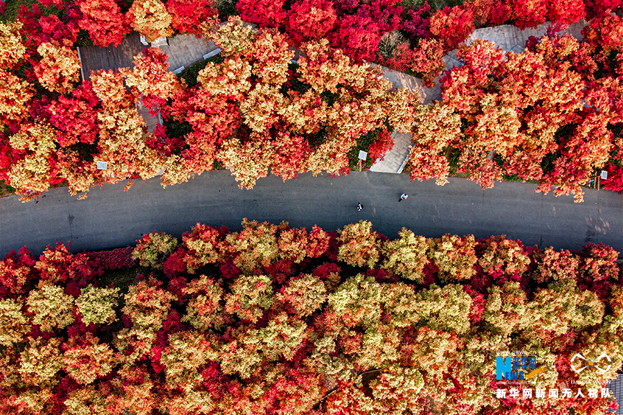 俯瞰植物園內(nèi),漫山遍野的紅楓呈現(xiàn)一派紅黃相間的海洋,像打翻的調(diào)色盤。新華網(wǎng)發(fā)(秦蒸 攝)