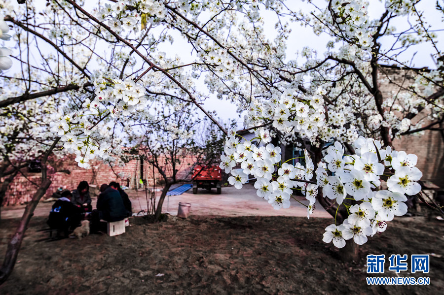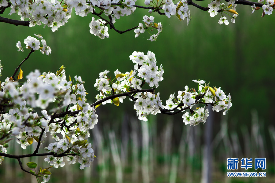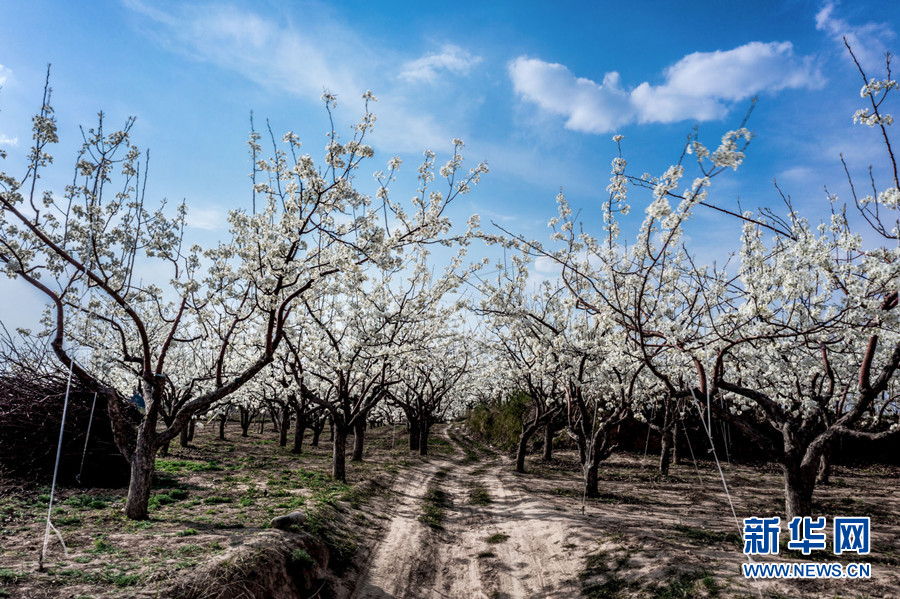 萬畝梨園中,朵朵梨花在枝頭怒放,簇擁相連宛若花海。新華網(wǎng) 發(fā)(亞明/攝)