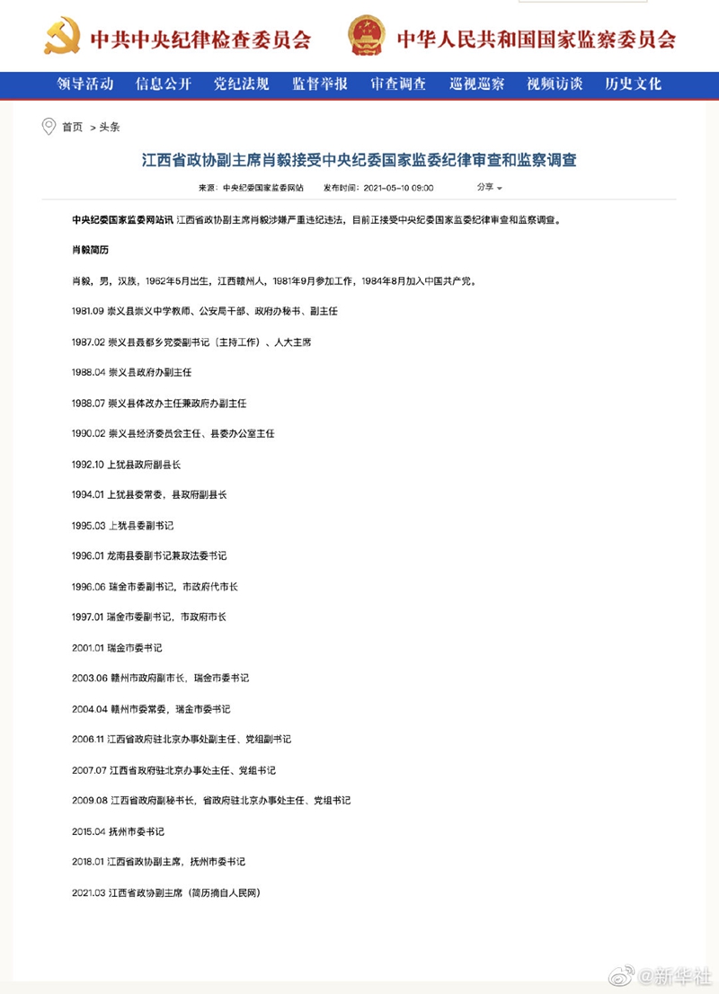 新華社北京5月10日電 江西省政協(xié)副主席肖毅涉嫌嚴(yán)重違紀(jì)違法,目前正接受中央紀(jì)委國家監(jiān)委紀(jì)律審查和監(jiān)察調(diào)查。
