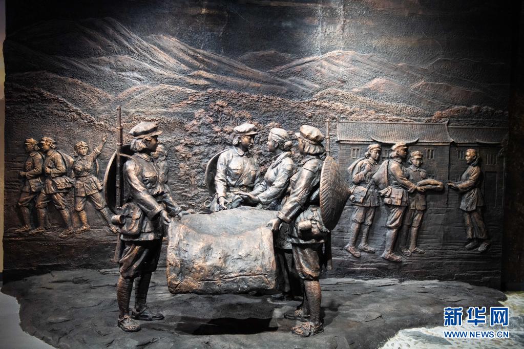 這是在湖南省郴州市汝城縣沙洲瑤族村“半條被子的溫暖”專題陳列館拍攝的“半條被子”故事雕塑(2020年9月17日攝)。新華社記者 陳思汗 攝