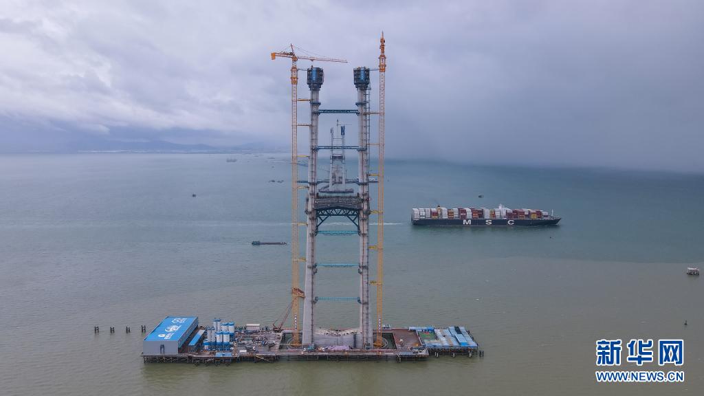 廣東省中山市深中通道建設(shè)工程伶仃洋大橋西索塔封頂現(xiàn)場(chǎng)(7月19日攝,無(wú)人機(jī)照片)。新華社發(fā)(陳旭彬 攝)