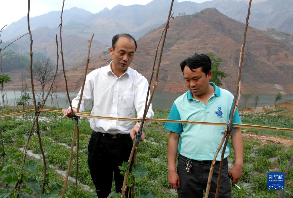 姜仕坤(左)在貴州晴隆縣長流鄉(xiāng)與村民交流(資料照片)。