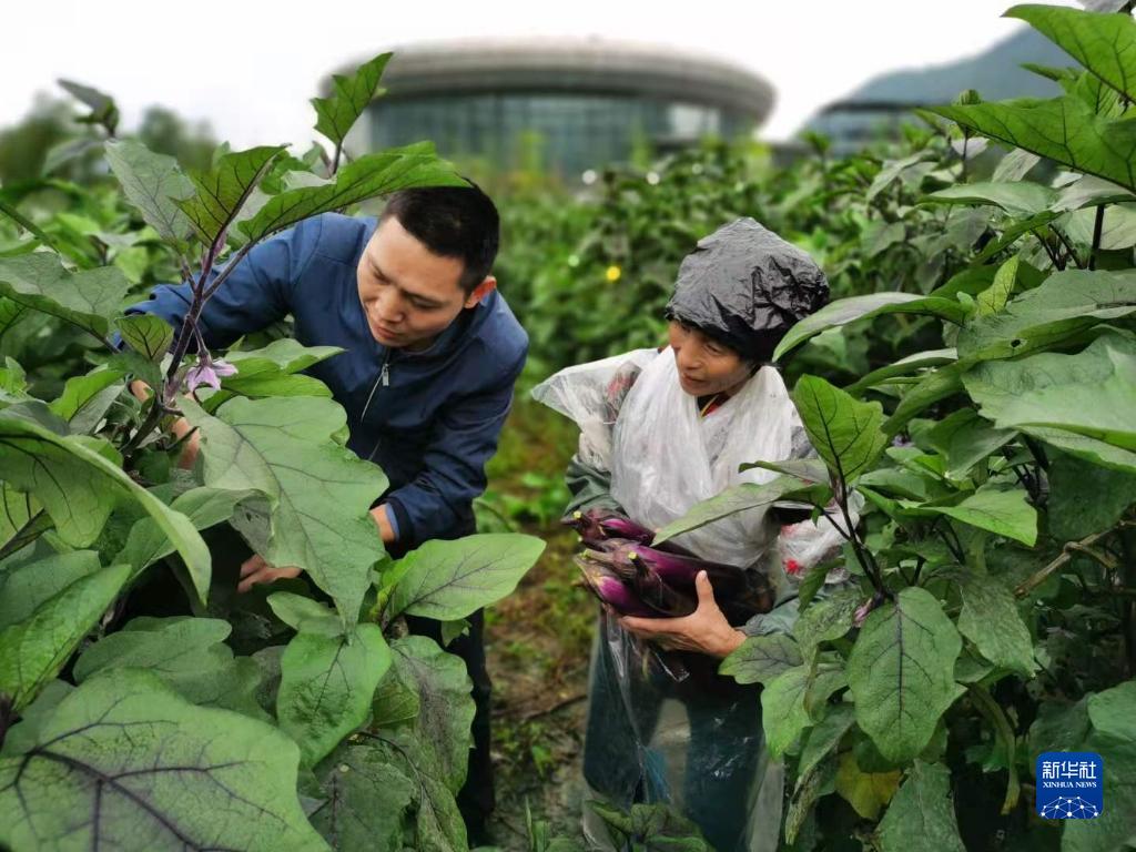 貴州省遵義市匯川區(qū)駐村干部余永流(左)和農(nóng)戶一起采摘茄子(資料照片)。新華社發(fā)