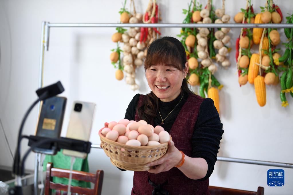 在安徽省六安市舒城縣南港鎮(zhèn)公義村錢元玲的家庭農(nóng)場,錢元玲在直播間售賣土雞蛋(2021年3月4日攝)。新華社記者 黃博涵 攝