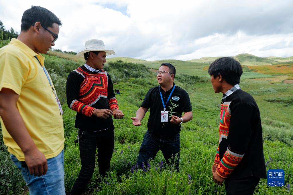 在位于四川省涼山彝族自治州昭覺縣龍溝鄉(xiāng)境內(nèi)黃芩種植基地,西南醫(yī)科大學(xué)副教授夏紀(jì)毅(右二)和該校派出的駐村工作隊(duì)員俄且莫機(jī)(左一)為當(dāng)?shù)匾妥迦罕娭v授黃芩種植和采摘技術(shù)(2020年8月14日攝)。新華社記者 沈伯韓 攝
