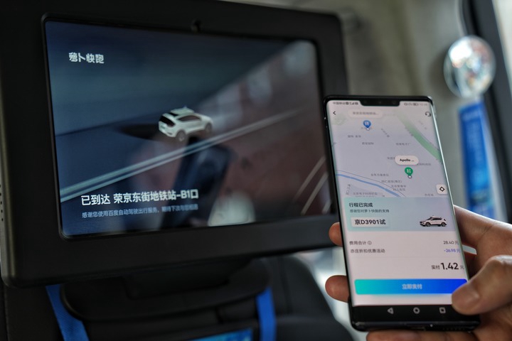 在北京經(jīng)濟(jì)技術(shù)開發(fā)區(qū)宏達(dá)南路,記者通過(guò)百度公司旗下“蘿卜快跑”App叫到一輛自動(dòng)駕駛車輛,目的地是約2.6公里外的大族廣場(chǎng)。“蘿卜快跑”App打車界面類似于常用的網(wǎng)約車軟件,不同的是乘客需要在設(shè)置好的站點(diǎn)上下車,這些站點(diǎn)間的距離約500米。