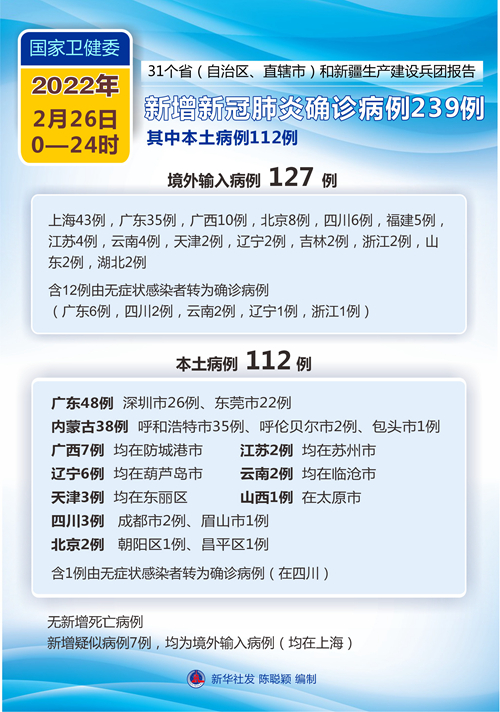 新華社北京2月27日電 國家衛(wèi)生健康委員會27日通報,2月26日0-24時,31個。ㄗ灾螀^(qū)、直轄市)和新疆生產(chǎn)建設兵團報告新增新冠肺炎確診病例239例。其中境外輸入病例127例(上海43例,廣東35例,廣西10例,北京8例,四川6例,福建5例,江蘇4例,云南4例,天津2例,遼寧2例,吉林2例,浙江2例,山東2例,湖北2例),含12例由無癥狀感染者轉為確診病例(廣東6例,四川2例,云南2例,遼寧1例,浙江1例);本土病例112例(廣東48例,其中深圳市26例、東莞市22例;內(nèi)蒙古38例,其中呼和浩特市35例、呼倫貝爾市2例、包頭市1例;廣西7例,均在防城港市;遼寧6例,均在葫蘆島市;天津3例,均在東麗區(qū);四川3例,其中成都市2例、眉山市1例;北京2例,其中朝陽區(qū)1例、昌平區(qū)1例;江蘇2例,均在蘇州市;云南2例,均在臨滄市;山西1例,在太原市),含1例由無癥狀感染者轉為確診病例(在四川)。無新增死亡病例。新增疑似病例7例,均為境外輸入病例(均在上海)。