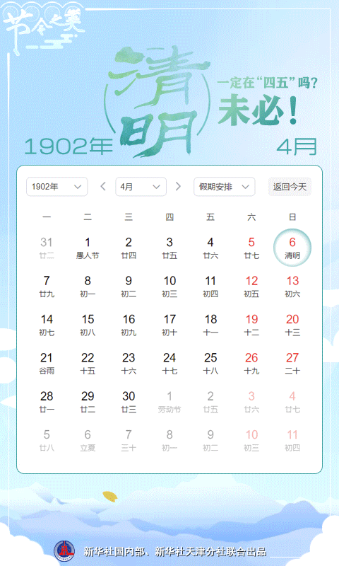 新華社天津4月5日電(記者周潤。4月5日迎來清明,應了民間“四五清明”一說。清明一定在“四五”嗎?未必!天文科普專家表示,清明一般在公歷的4月4日到6日之間變動,但以4日和5日居多。