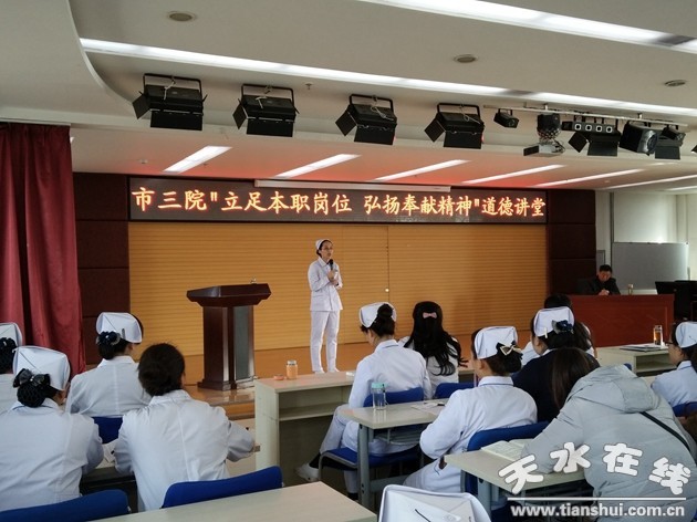 2月24日,醫(yī)院舉辦了主題為“立足本職崗位,弘揚奉獻精神”的道德講堂活動。天水市勞動模范、醫(yī)院中西醫(yī)結(jié)合科護士長李紅芳作了專題講座,講述了發(fā)生在她自己身上的感人故事和先進事跡,展示了助人為樂、誠實守信、敬業(yè)奉獻、孝老愛親的崇高道德品質(zhì),引導大家弘揚新時代雷鋒精神,積極投身于道德實踐,讓更多的“雷鋒”在醫(yī)院涌現(xiàn);顒佑舍t(yī)院紀委書記周長生主持,醫(yī)院班子成員和干部職工200余人參加。