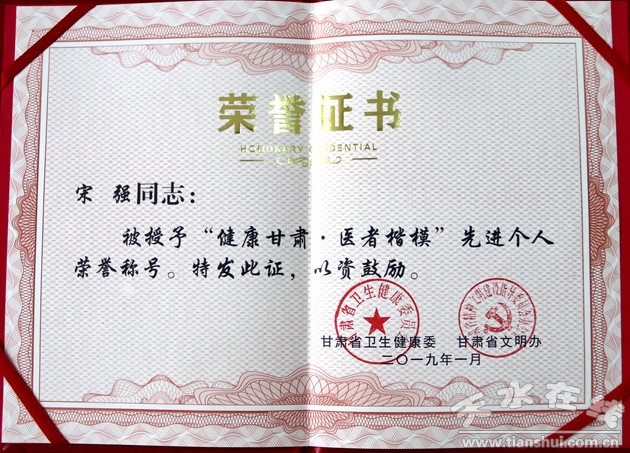 近日,從省衛(wèi)生健康委下發(fā)文件獲悉,天水市第五人民醫(yī)院結(jié)核病科科長宋強同志被省文明委、省衛(wèi)健委聯(lián)合表彰為“健康甘肅·醫(yī)者楷!毕冗M個人,成為天水市衛(wèi)健系統(tǒng)7名獲此榮譽的醫(yī)務(wù)工作者之一。
