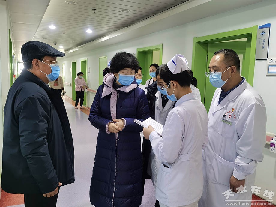2021年1月5日,市衛(wèi)健委副主任李姝帶領(lǐng)第一考核組到天水市第一人民醫(yī)院開展2020年度全市疫情防控和衛(wèi)生健康重點工作任務(wù)督查。黨委書記問肅生,黨委副書記、院長王定新及相關(guān)科室負責人陪同檢查。