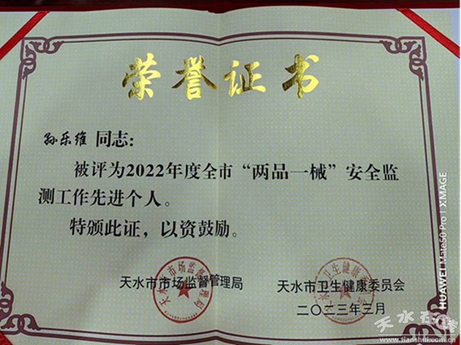 4月27日,天水市2023年藥械化不良反應(yīng)監(jiān)測(cè)工作會(huì)議于秦州區(qū)人民醫(yī)院會(huì)議廳召開。會(huì)上,我院孫樂維同志被評(píng)為2022年度全市“兩品一械”安全監(jiān)測(cè)工作先進(jìn)個(gè)人。