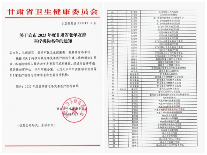 近日,甘肅省衛(wèi)生健康委員會(huì)發(fā)布《關(guān)于公布甘肅省老年友善醫(yī)院機(jī)構(gòu)名單的通知》,天水市麥積區(qū)中醫(yī)醫(yī)院(市二院南院區(qū))經(jīng)過機(jī)構(gòu)自評(píng)、區(qū)級(jí)初審評(píng)估、市級(jí)復(fù)核審查和省級(jí)專家組復(fù)審,被評(píng)定為“甘肅省老年友善醫(yī)療機(jī)構(gòu)”。
