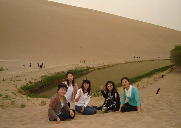 圖為5月3日幾位游客在月牙泉邊留影 配圖:天水在線