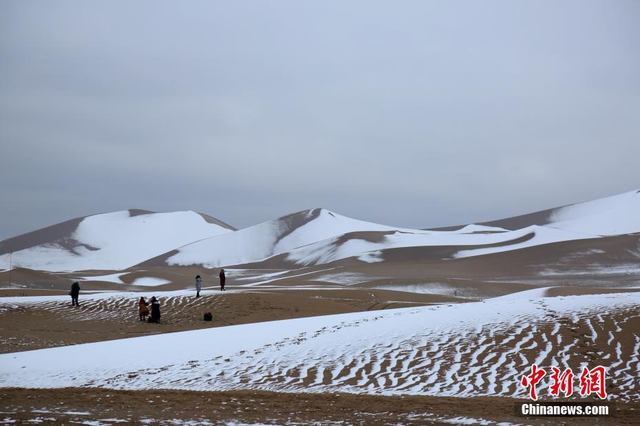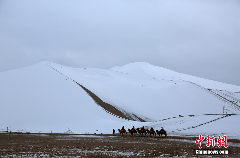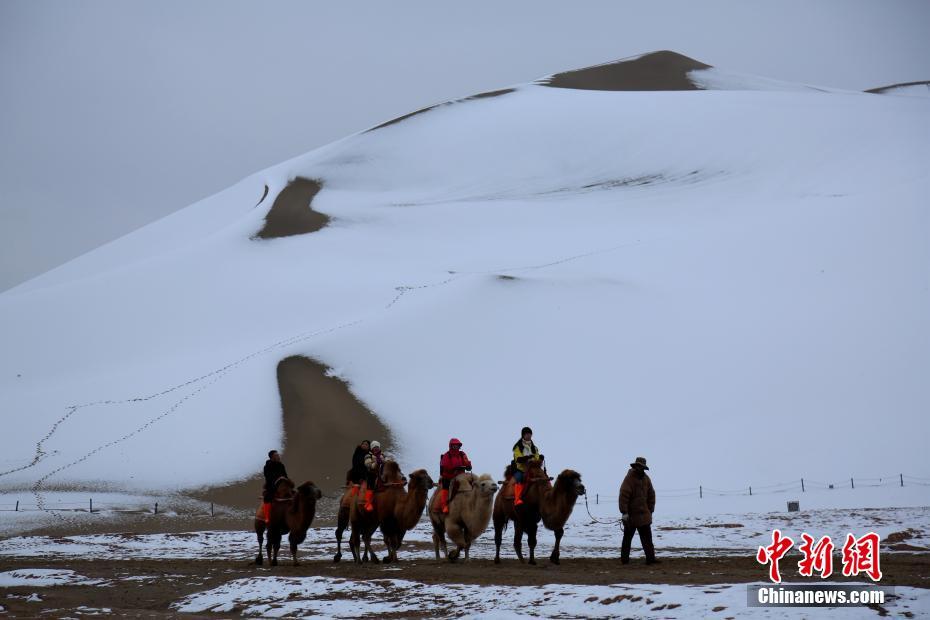 11月14日,敦煌飄起雪花,雪后的鳴沙山月牙泉風(fēng)景名勝區(qū),“素顏”迎客。清脆的駝鈴聲在大漠間回蕩,游客置身其中,宛如穿越在千年絲路。沙雪交融,如詩(shī)如畫。張曉亮 攝