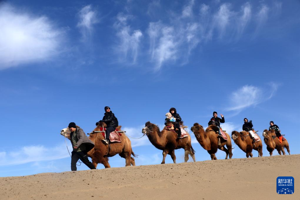 12月1日,游客在甘肅省敦煌市鳴沙山月牙泉景區(qū)騎駱駝游覽。