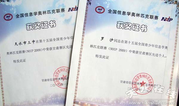 2009年“第十五屆全國青少年信息學(計算機)奧林匹克分區(qū)聯(lián)賽(NOIP 2009)”甘肅賽區(qū)成績?nèi)涨敖視裕焖腥腥〉脙?yōu)異成績,9名同學獲得了甘肅賽區(qū)獎勵,其中1人獲得國家級二等獎和省級一等獎,2人獲得省級二等獎,6人獲得省級三等獎;天水市三中被甘肅省青少年信息學(計算機)奧林匹克競賽委員會授予先進單位;天水市三中輔導教師許霞、楊政、茍世同被評為聯(lián)賽甘肅賽區(qū)指導教師一等獎;天水市三中校長羅沙獲聯(lián)賽甘肅賽區(qū)先進個人。