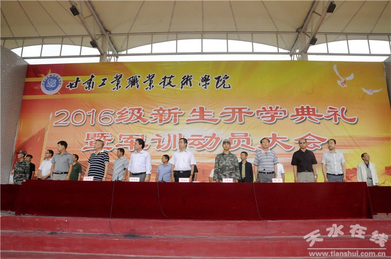 9月5日上午9:00,甘肅工業(yè)職業(yè)技術(shù)學(xué)院在該校田徑操場隆重舉行2016級新生開學(xué)典禮暨軍訓(xùn)動(dòng)員大會(huì)。該校校領(lǐng)導(dǎo)和各職能部門負(fù)責(zé)人、各二級學(xué)院黨總支書記、參訓(xùn)教官、教導(dǎo)員、指導(dǎo)員,以及2016級全體新生和教師代表參加。副校長徐凱同志主持典禮。