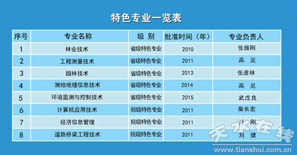 五是打造特色專業(yè)。我院實施專業(yè)分類指導(dǎo)、分層建設(shè)的辦法,實現(xiàn)了重點發(fā)展、特色發(fā)展、綜合發(fā)展的良好格局。制定了《院級特色(骨干)專業(yè)遴選建設(shè)辦法》,按照“理念先進,改革領(lǐng)先,師資合理,特色明顯,就業(yè)率高”的具體要求,至“十二五”末,評建了10個院級特色專業(yè)。對評選出的特色專業(yè),學(xué)院在校企合作、實驗實訓(xùn)條件建設(shè)、師資隊伍建設(shè)、教學(xué)改革、產(chǎn)學(xué)研合作、招生等方面給予重點支持,三年間給予每個專業(yè)200萬的專項建設(shè)經(jīng)費。目前,學(xué)院初步形成了以林業(yè)生態(tài)、資源環(huán)境類專業(yè)為主的特色專業(yè)群,在院內(nèi)、省內(nèi)、國內(nèi)已起到了良好的示范引領(lǐng)作用,品牌效應(yīng)不斷擴大。林業(yè)技術(shù)、水土保持、環(huán)境監(jiān)測與治理技術(shù)、工程測量技術(shù)4個專業(yè)為國家示范校重點建設(shè)專業(yè),林業(yè)技術(shù)、園林技術(shù)、工程測量技術(shù)、地理信息與地圖制圖技術(shù)、環(huán)境監(jiān)測與控制技術(shù)等5個專業(yè)為甘肅省特色專業(yè),森林資源保護、園林工程技術(shù)兩個專業(yè)為教育部財政部支持的高等職業(yè)學(xué)校提升專業(yè)服務(wù)產(chǎn)業(yè)發(fā)展能力建設(shè)專業(yè)。近年來,林業(yè)技術(shù)專業(yè)、園林技術(shù)專業(yè)、工程測量技術(shù)專業(yè)等特色專業(yè)的年終就業(yè)率均達90%以上。通過特色專業(yè)彰顯了學(xué)院行業(yè)特色、辦學(xué)特色,以辦學(xué)特色凸顯學(xué)院品牌,以品牌提高了學(xué)院的競爭力。