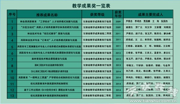 學(xué)院自2001年升格以來,共評選院級教學(xué)成果獎29項,其中11項獲甘肅省教學(xué)成果獎;教師承擔(dān)各類研究項目240余項,其中教育部項目3項、國家林業(yè)局項目2項,交通部項目1項、CEPF項目1項、WWF項目1項、國家自然基金項目1項、國家科技基礎(chǔ)平臺建設(shè)專項子項目1項、省科技廳項目7項,1項達到國際領(lǐng)先, 18項國內(nèi)先進,7項國內(nèi)領(lǐng)先,獲獎41項;發(fā)現(xiàn)命名樹木新種5種;公開發(fā)表論文1700余篇,其中國家級500余篇,核心期刊185篇,EI收錄18篇;出版教材、專著400余部,編輯出版《甘肅林業(yè)高職教育》28期。承擔(dān)、參與完成了40余項社會服務(wù)與工程項目。