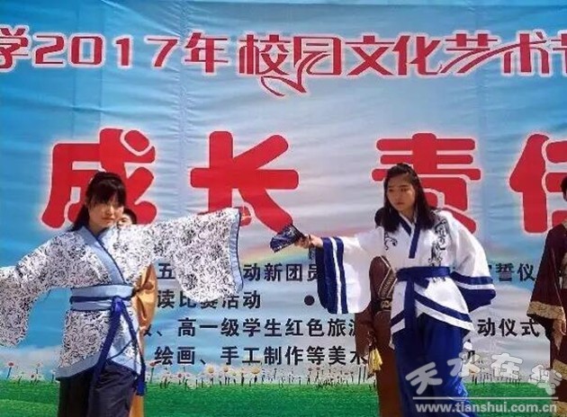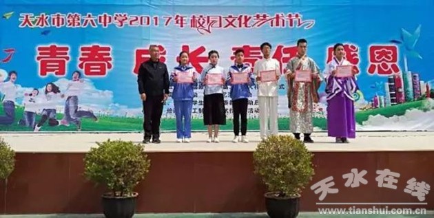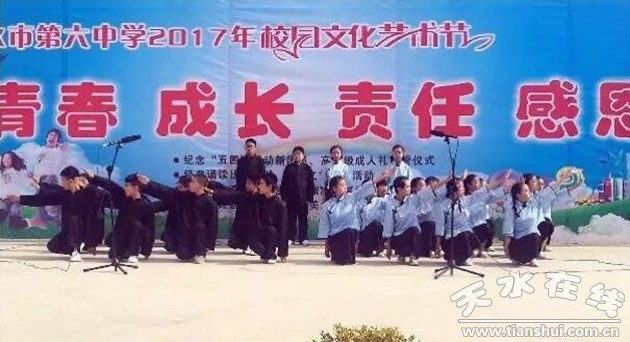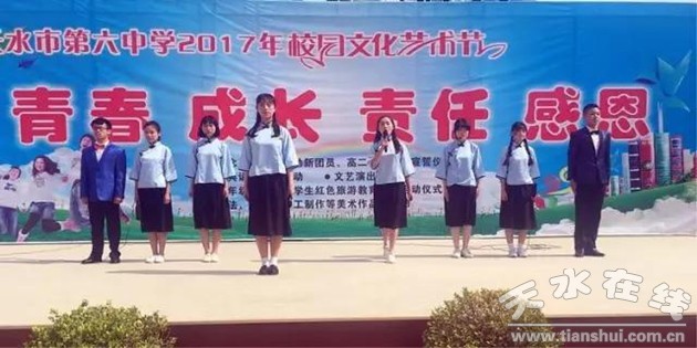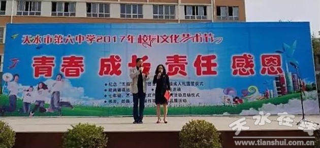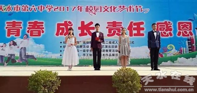 5月11日上午天水市第六中學(xué)開展了"青春、成長、責(zé)任、感恩"經(jīng)典詩文誦讀活動。校長李美喜、黨支部書記武榮國、副校長汪濤、溫瀟順、崔勝潮,全校師生共2000多人參加了活動,活動由政教處主任汪伍荃主持。