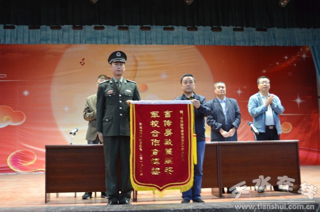 大會對本次軍訓(xùn)中表現(xiàn)突出的集體和個人進(jìn)行了表彰,周和平副校長代表學(xué)校向本次承訓(xùn)的蘭州國防教育基地贈送了錦旗。
