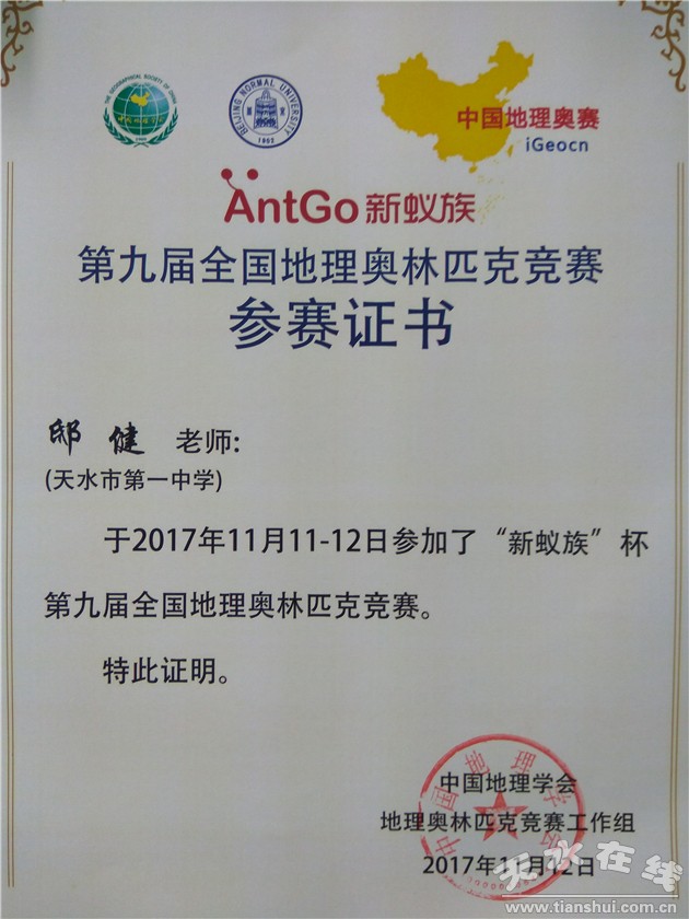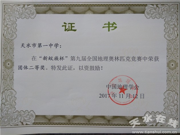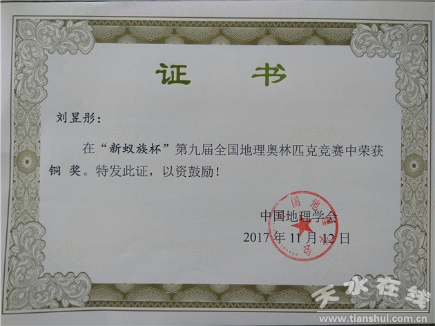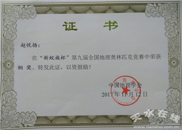 2017年11月10日—11月12日,在廣東省佛山市舉行的“第九屆全國中學(xué)生地理奧林匹克競賽”決賽中,天水一中地理奧賽隊指導(dǎo)教師邸健帶領(lǐng)學(xué)校代表隊參加了比賽,天水一中高二(18)班趙悅揚、劉昱彤、劉梓淏三位同學(xué)勇于拼搏、不負(fù)眾望,收獲了全國決賽團體二等獎,并摘得個人銅牌兩枚。