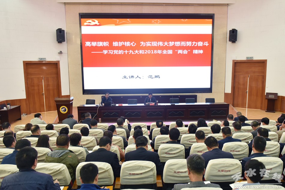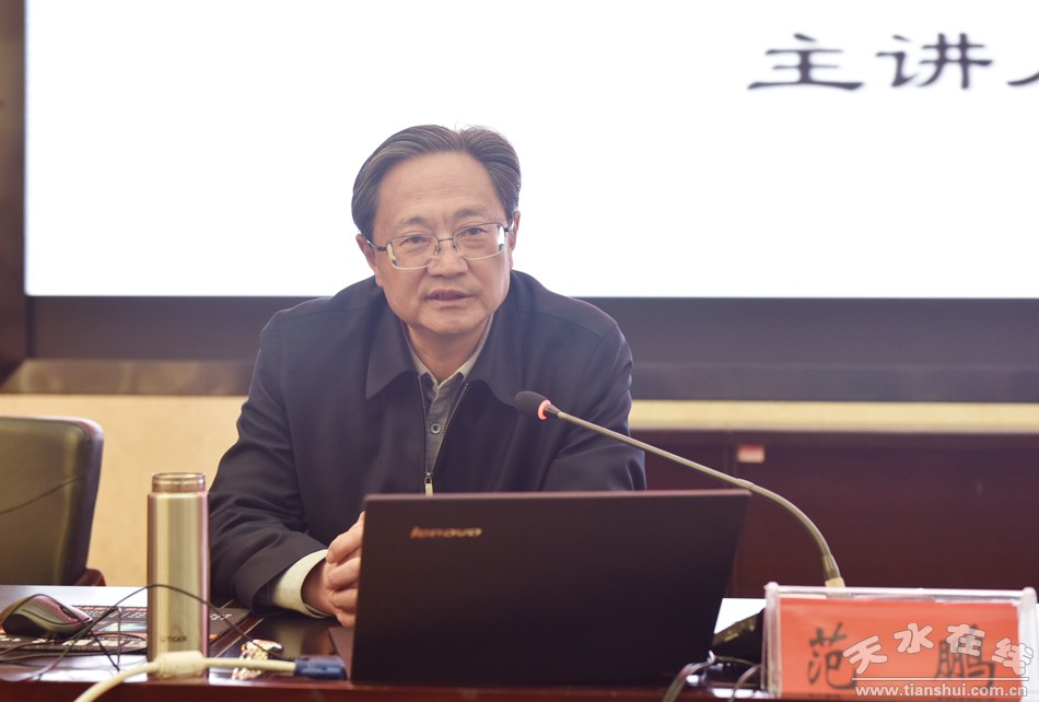 4月16日下午,天水師范學(xué)院在二號(hào)報(bào)告廳召開黨委中心組(擴(kuò)大)專題學(xué)習(xí)會(huì)議,邀請(qǐng)省人大常委會(huì)教科文衛(wèi)工作委員會(huì)主任、十三屆全國(guó)人大代表、省十九大宣講團(tuán)成員范鵬教授作了題為《高舉旗幟 維護(hù)核心 為實(shí)現(xiàn)偉大夢(mèng)想而努力奮斗——學(xué)習(xí)黨的十九大和2018年全國(guó)“兩會(huì)”精神》的專題輔導(dǎo)報(bào)告,學(xué)校在家黨委常委、“兩委”委員、全體科級(jí)干部、部分思政課教師和馬克思主義學(xué)院學(xué)生代表參加會(huì)議,會(huì)議由黨委書記馬建東主持。