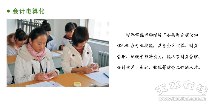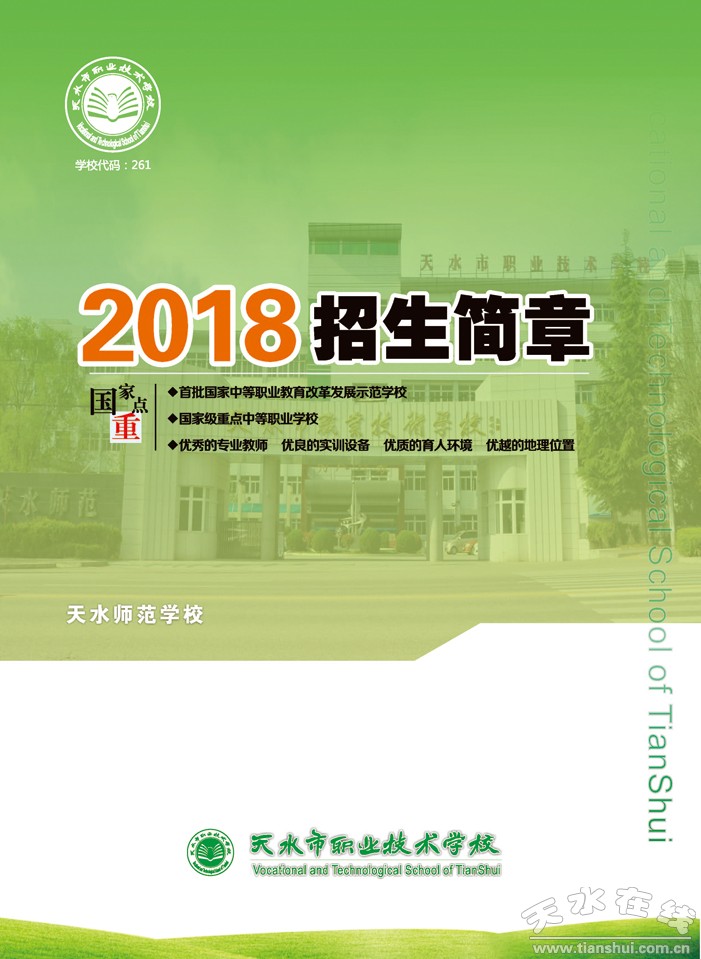 天水市職業(yè)技術(shù)學(xué)校是一所全日制中等專業(yè)學(xué)校,2007年由天水師范和天水職業(yè)中專兩校合并而成,隸屬天水市教育局。是首批“國家中等職業(yè)教育改革發(fā)展示范學(xué)!,首批國家級重點(diǎn)中等職業(yè)學(xué)校,首批甘肅省中等師范標(biāo)準(zhǔn)化學(xué)校,全國第一批信息化環(huán)境下教育教學(xué)模式改革和創(chuàng)新探索試點(diǎn)單位,全國現(xiàn)代學(xué)徒制第二批試點(diǎn)學(xué)校,國家職業(yè)技能鑒定單位,省市勞動力培訓(xùn)基地,全國職工教育培訓(xùn)優(yōu)秀示范點(diǎn)。