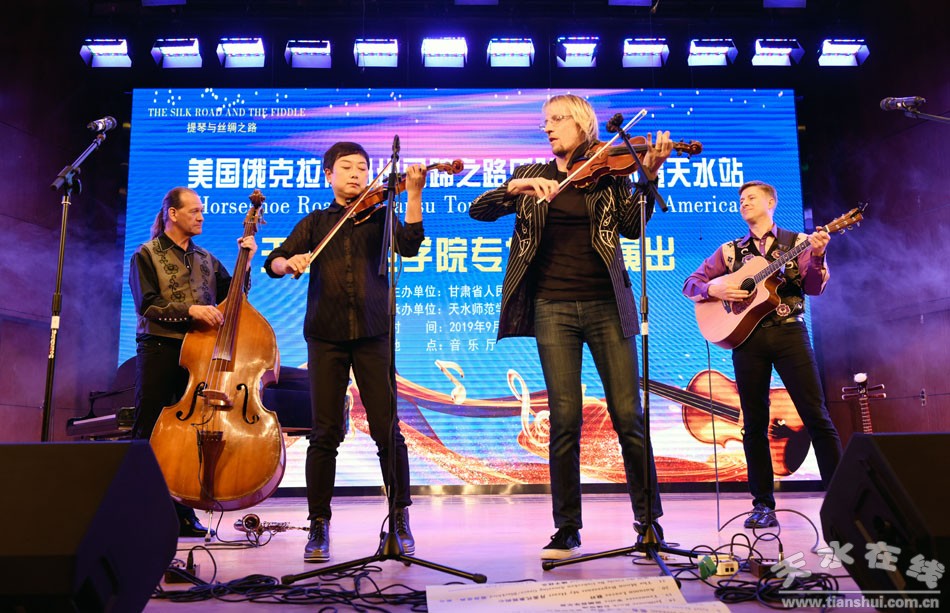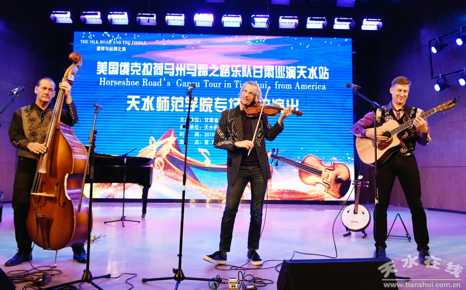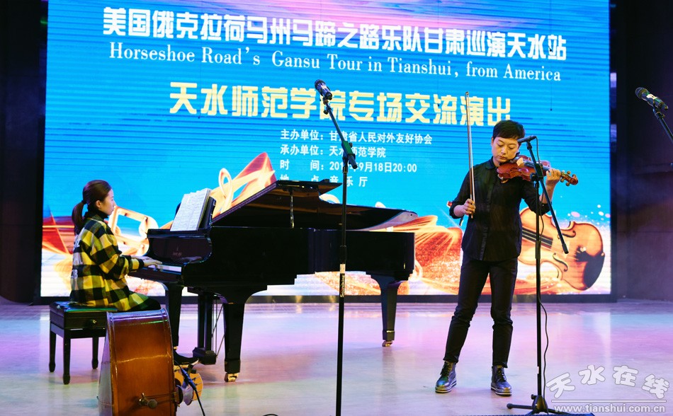 當晚,“馬蹄之路”小提琴樂隊為學校師生以及參加“百校結(jié)好”活動的天水一中、天水逸夫?qū)嶒炛袑W教師演奏了美國西部鄉(xiāng)村音樂曲目以及中國觀眾耳熟能詳?shù)慕?jīng)典樂曲。學校教師與“馬蹄之路”樂隊聯(lián)袂演出了“月亮代表我的心”、意大利作曲家蒙蒂作品“查爾達什舞曲”等曲目。中美教師同臺演出、切磋交流了小提琴表演藝術(shù),讓觀眾留下了深刻的印象;樂隊精湛的演出技藝和激情四射的舞臺表演,贏得觀眾的陣陣掌聲,讓學校師生領(lǐng)略到來自美國純正的原創(chuàng)小提琴音樂,近距離感受了跨國界文化藝術(shù)相互交織的魅力。