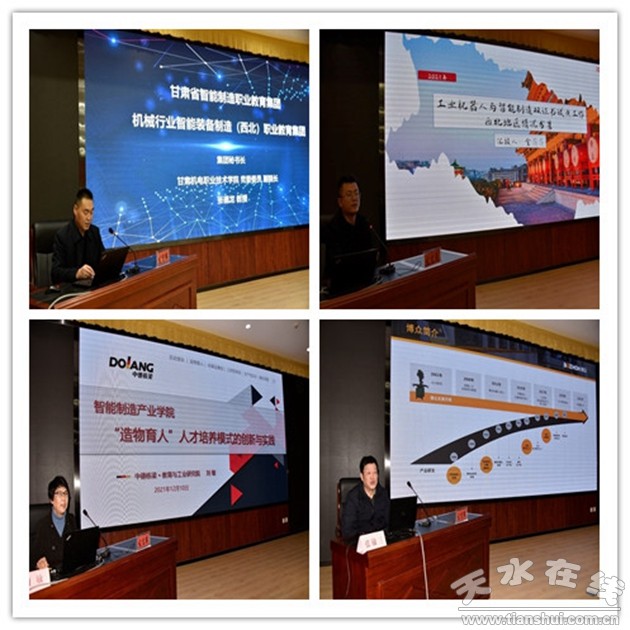 12月10日,甘肅省智能制造職業(yè)教育集團(tuán)、機(jī)械行業(yè)智能裝備制造(西北)職業(yè)教育集團(tuán)2021年年會在甘肅機(jī)電職業(yè)技術(shù)學(xué)院召開。江蘇匯博機(jī)器人技術(shù)股份有限公司、山東棟梁科技設(shè)備有限公司、江蘇博眾精工科技股份有限公司及有關(guān)職業(yè)院校等成員單位共聚一堂,共商職業(yè)教育發(fā)展。集團(tuán)秘書長、學(xué)院黨委委員、副院長張德龍受集團(tuán)理事長、學(xué)院黨委書記堅(jiān)葆林委托致歡迎辭。學(xué)院黨委委員、副院長毛文輝應(yīng)邀出席會議。會議由集團(tuán)副秘書長、智能控制學(xué)院(二級學(xué)院)院長王澤蔭主持。
