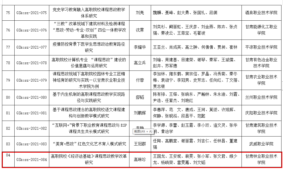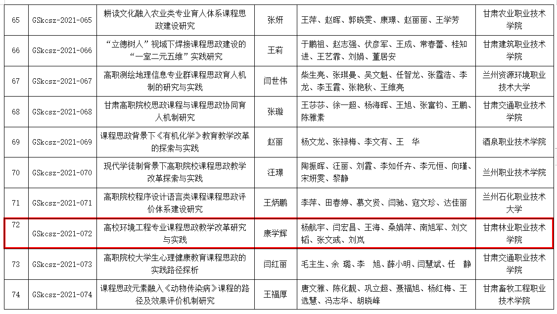 近日,甘肅省教育廳公布了2021年甘肅省高校課程思政示范項目名單,由黨委書記高云峰主持的甘肅林業(yè)職業(yè)技術(shù)學(xué)院課程思政教學(xué)研究示范中心被立項為甘肅省課程思政教學(xué)研究示范中心,由李鴻杰教授主持的林業(yè)技術(shù)課程思政示范專業(yè)被立項為甘肅省課程思政示范專業(yè),《高校環(huán)境工程專業(yè)課程思政教學(xué)改革研究與實踐》和《高職院校〈經(jīng)濟(jì)法基礎(chǔ)〉課程思政教學(xué)改革研究》項目被立項為課程思政建設(shè)研究項目。