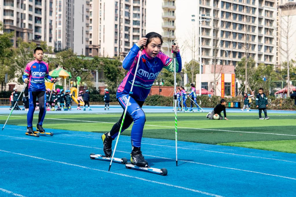 2022年2月24日,在重慶樹人博文小學的冰雪運動體育課上,孩子們正在練習旱地滑雪。新華社記者唐奕攝