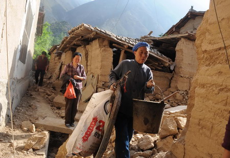 5月14日,甘肅省隴南市文縣城關(guān)鎮(zhèn)元茨頭村村民從被地震破壞的房屋內(nèi)轉(zhuǎn)移出生活用品。 |