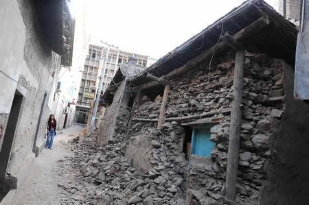 5月14日,在甘肅省隴南市文縣縣城,一位居民走過(guò)地震中嚴(yán)重受損的民房。