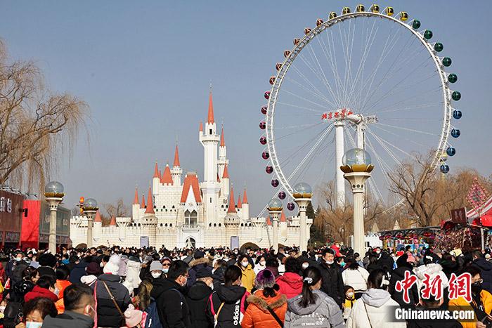 1月22日,農(nóng)歷正月初一,北京石景山游樂園里已經(jīng)熱鬧非凡,迎春廟會吸引了大量游客到來。