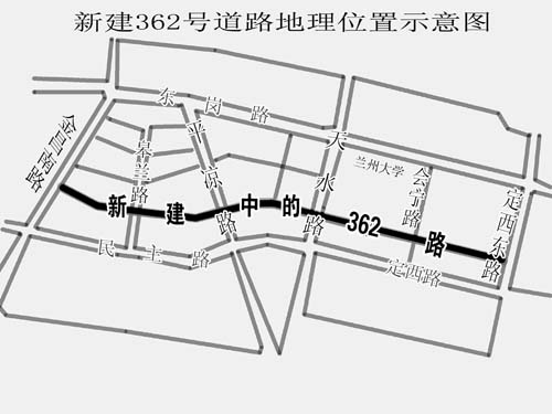 362#規(guī)劃路的定位為東西向的城市次干道,工程包括道路拆遷、污雨水、綠化等附屬設施建設。該條道路拓建完成后,可打通金昌南路、皋蘭路、平涼路、天水南路、會寧路和定西東路等多條城市重要道路,因此,362#路的拓建對完善、優(yōu)化市區(qū)路網建設,緩解東方紅廣場周邊交通狀況以及小街巷整治等都具有重要意義。362#路西段部分與素有“餐飲文化休閑街”之譽的甘南路平行,因此周邊居民普遍看好該條道路的商業(yè)價值,認為其有望成為一條“休閑商業(yè)街”。