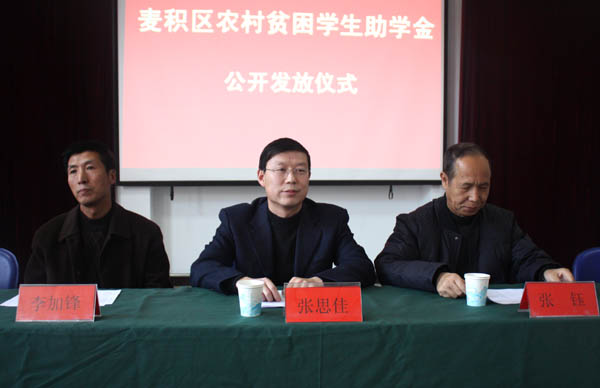 麥積區(qū)委常委、組織部長張思佳,區(qū)關(guān)工委常務(wù)副主任張鈺,區(qū)人大副主任李加峰,團區(qū)委、區(qū)教育局、啟升中學(xué)及中灘中心學(xué)校的負(fù)責(zé)同志出席了發(fā)放儀式并為受助學(xué)生發(fā)放了助學(xué)金。