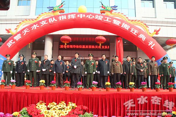 落成典禮上,張景輝代表天水市四大組織和全市360萬人民,對武警天水市支隊指揮中心的竣工搬遷表示熱烈祝賀,向常年戰(zhàn)斗在處突一線的武警官兵表示親切問候。張景輝說,武警天水市支隊在省武警總隊和市委、市政府的正確領(lǐng)導下,堅持聽黨指揮、服務人民、英勇善戰(zhàn),視人民為親人,把駐地當故鄉(xiāng),在完成各種急難險重任務中發(fā)揮了突擊隊作用,為維護社會穩(wěn)定,促進經(jīng)濟發(fā)展做出了積極貢獻,是一支關(guān)鍵時刻能夠拉得出、用得上、打得贏和天水人民信得過、靠得住的好部隊。他希望,武警支隊廣大官兵能以指揮中心落成使用為新起點,以更加昂揚的精神狀態(tài),積極踐行當代革命軍人的核心價值觀,開拓進取,扎實工作,不斷提高執(zhí)勤、處突和反恐能力,努力把部隊建設成為敢于上一線、善于打頭陣的英雄部隊,為建設平安和諧天水做出新的更大的貢獻。